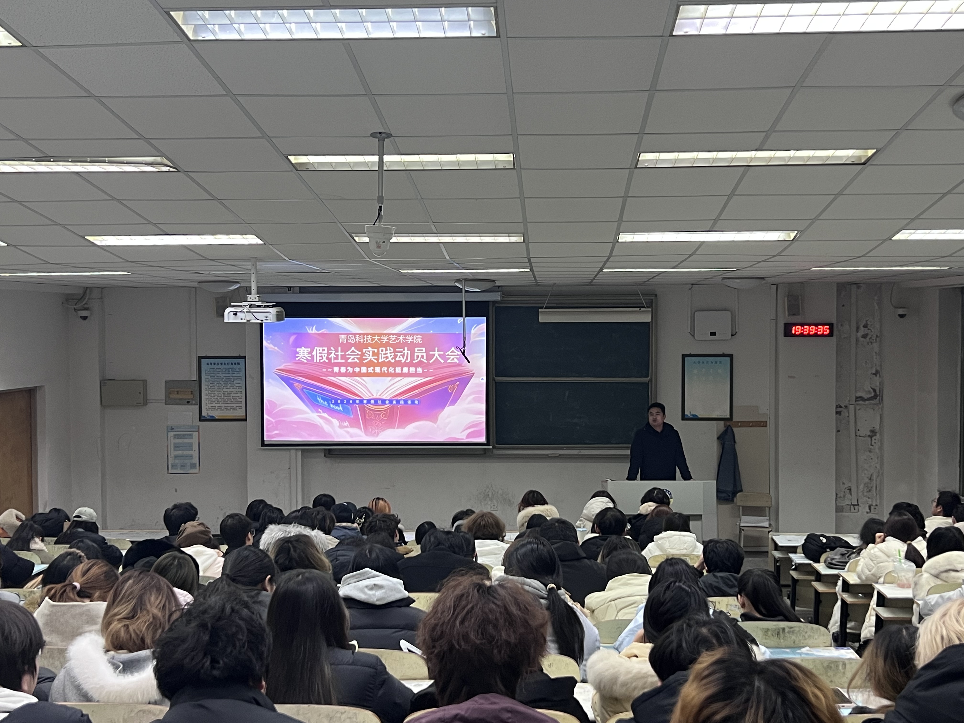 在弘毅楼B201教室开展寒假社会实践动员大会。学院团委颜枫及2025级本科生参加会议。